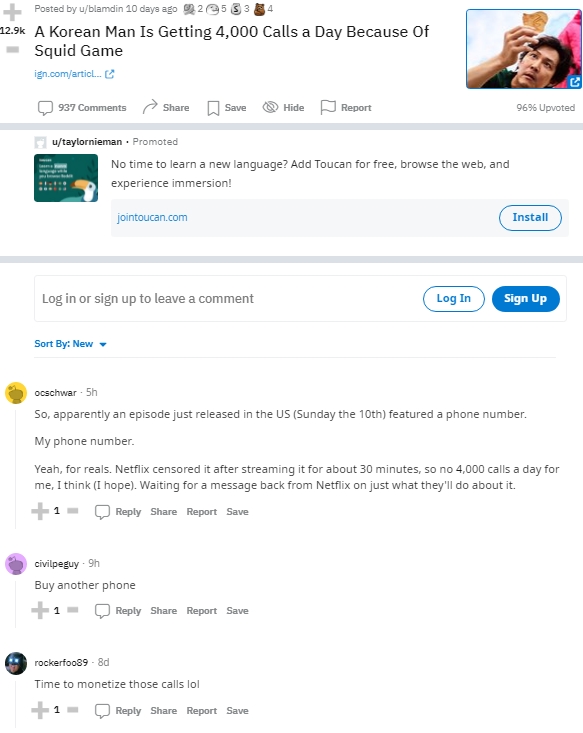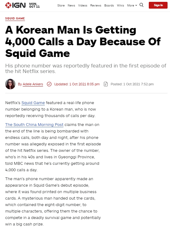 넷플릭스의 오징어 게임은 실제 한 사람의 번호를 노출해서 하루에 수천 통의 전화를 받게 했다.