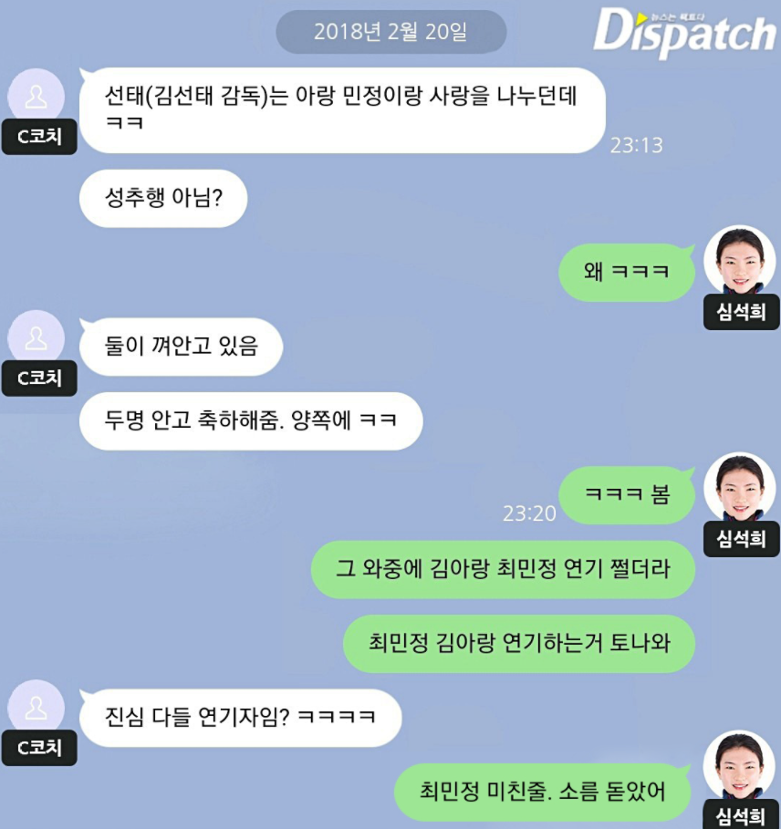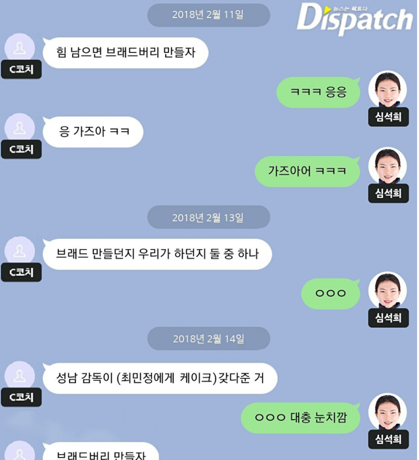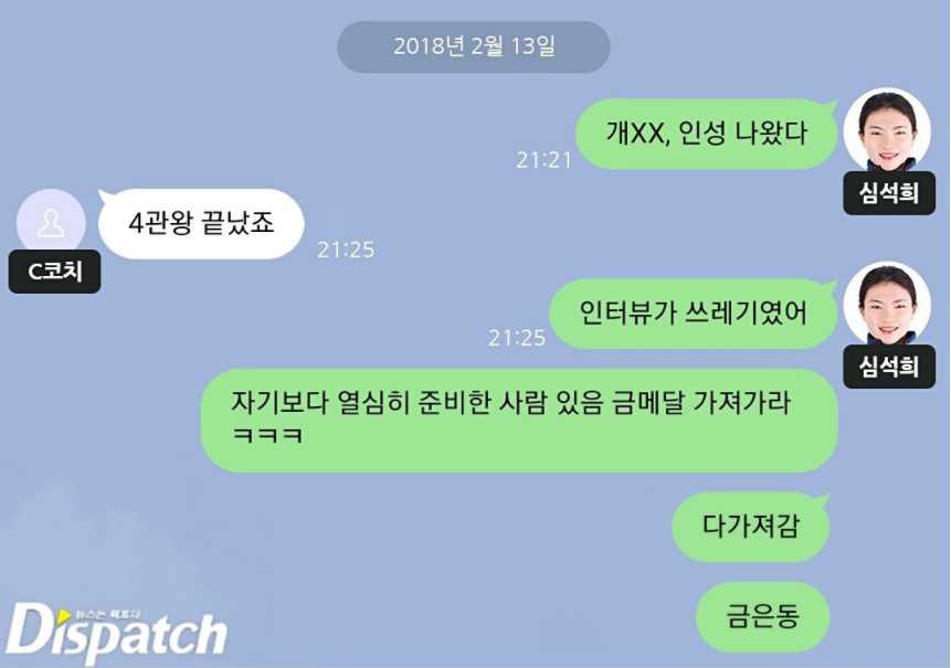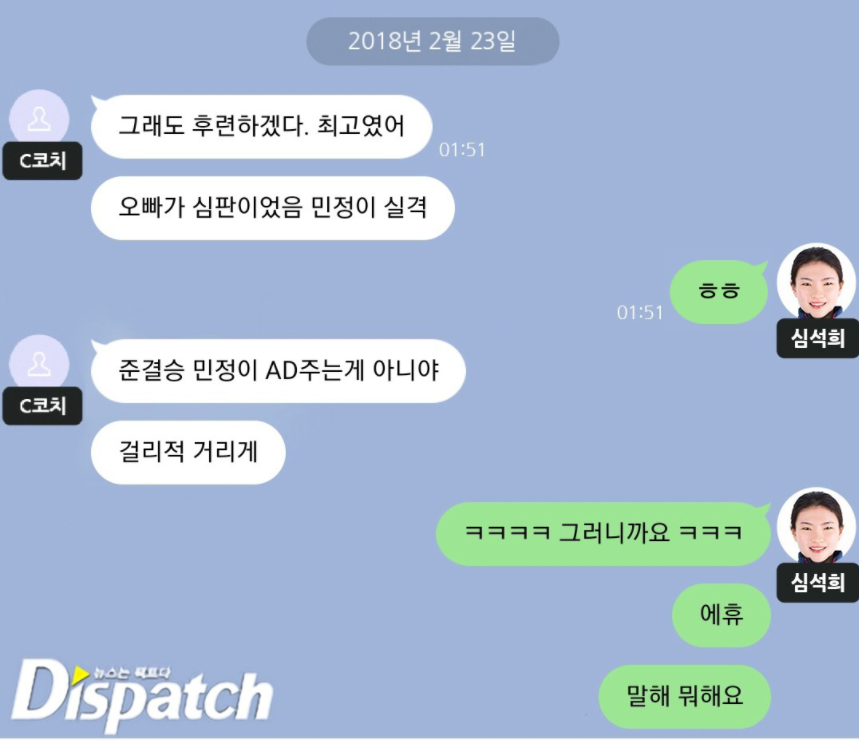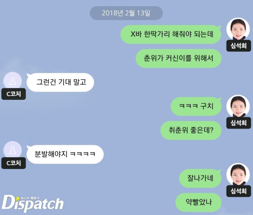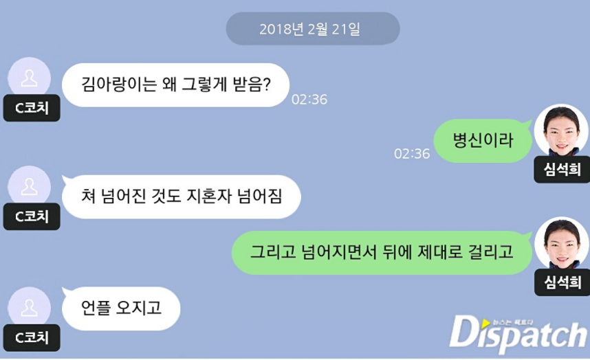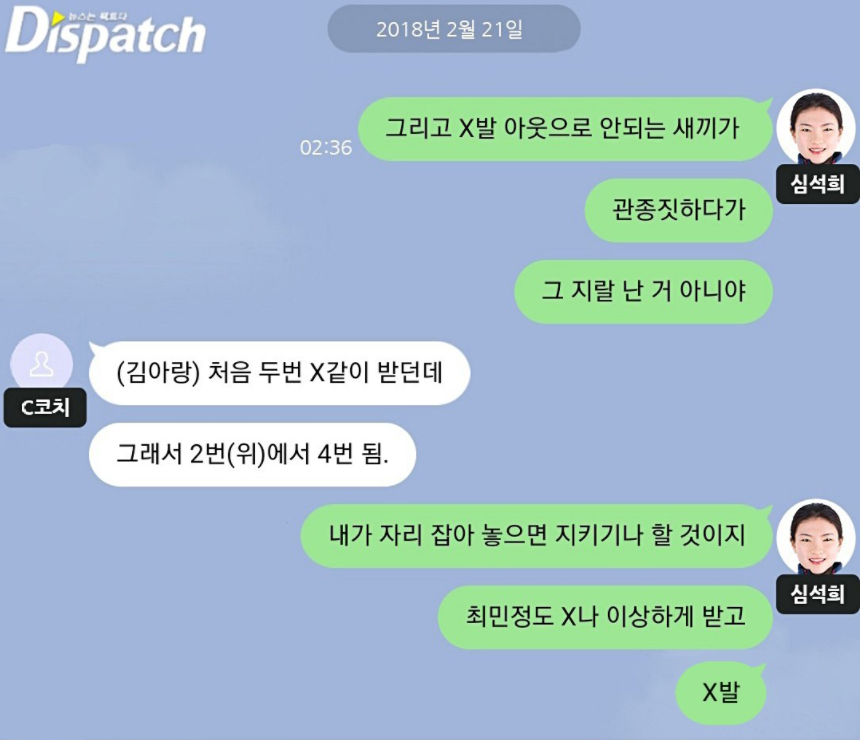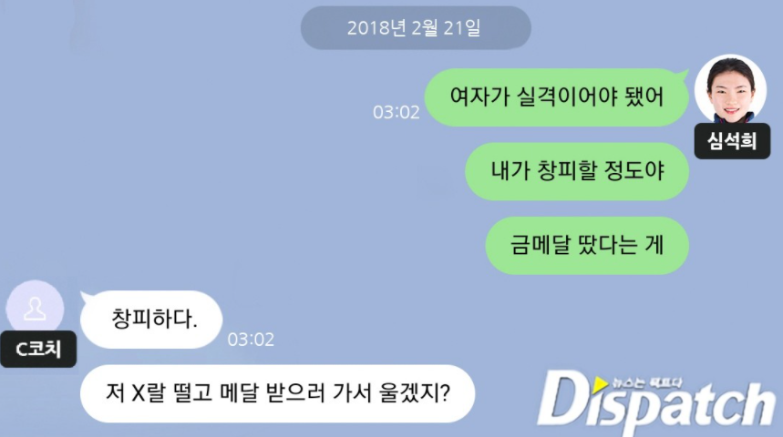 디스패치가 밝힌 심석희가 코치와 주고받은 카톡내용