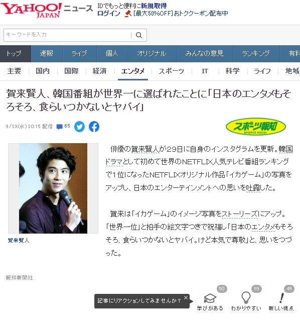 일본배우 카쿠 켄토가 넷플릭스 오리지널 한국 드라마 "오징어 게임"이 세계 1위에 랭크된 것을 축하하며, 일본의 엔터테인먼트에 대한 소신을 밝혔습니다. 이에 한국의 엔터테인먼트 시스템과 비교하며 일본의 현실을 한탄하는 댓글들이 주를 이루었습니다.