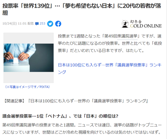 (관련기사 : “일본은 100 위에도 들어가지 못하는 ”… 세계의 “국회의원 선거 투표율 ” 랭킹 )