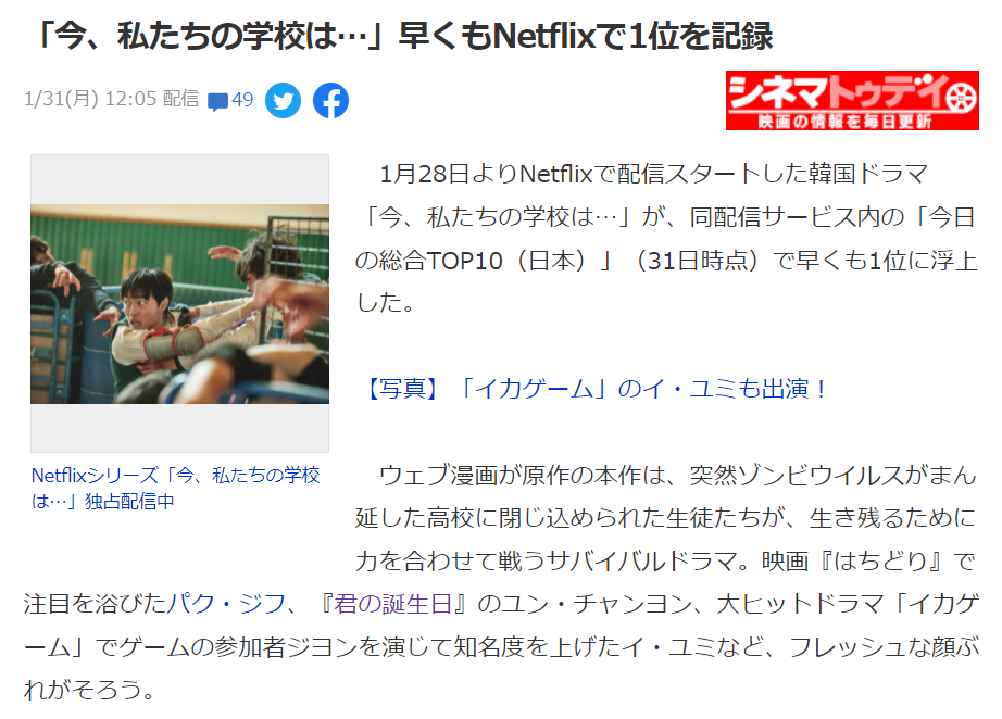 지난 1월 28일 넷플릭스에서 전 세계 동시 공개된 '지금 우리 학교는 '이 일본 넷플릭스에서도 1위를 차지하였습니다 .