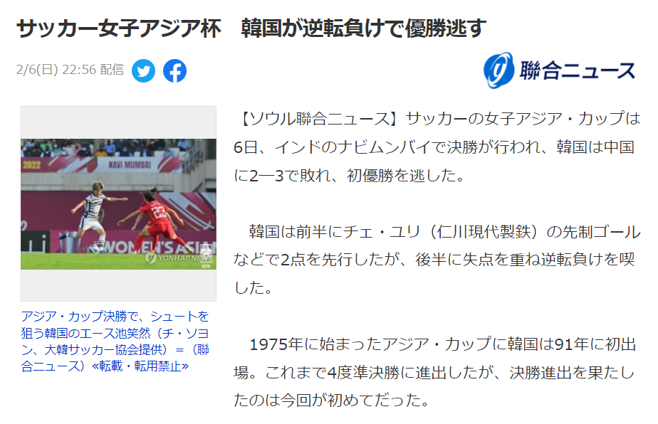 한국 여자축구가 아시안컵에서 역대 최고 성적인 준우승을 거뒀습니다. 경기 종료 2분을 남기고 역전 골을 허용하여 패배했지만, 장족의 발전을 이룬 한국 여자축구 대표팀이었습니다. 아래는 일본언론의 보도 내용과 야후 뉴스의 댓글 반응입니다.