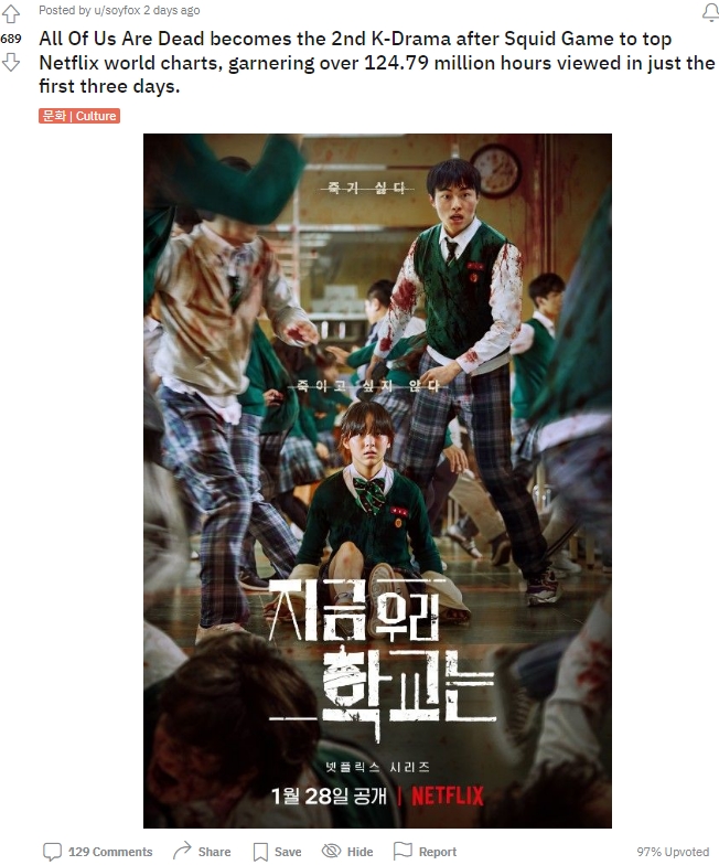 '지금 우리 학교는'은 '오징어 게임' 이후에 첫 3일만에 1억 2천만 이상의 시청 시간을 기록한