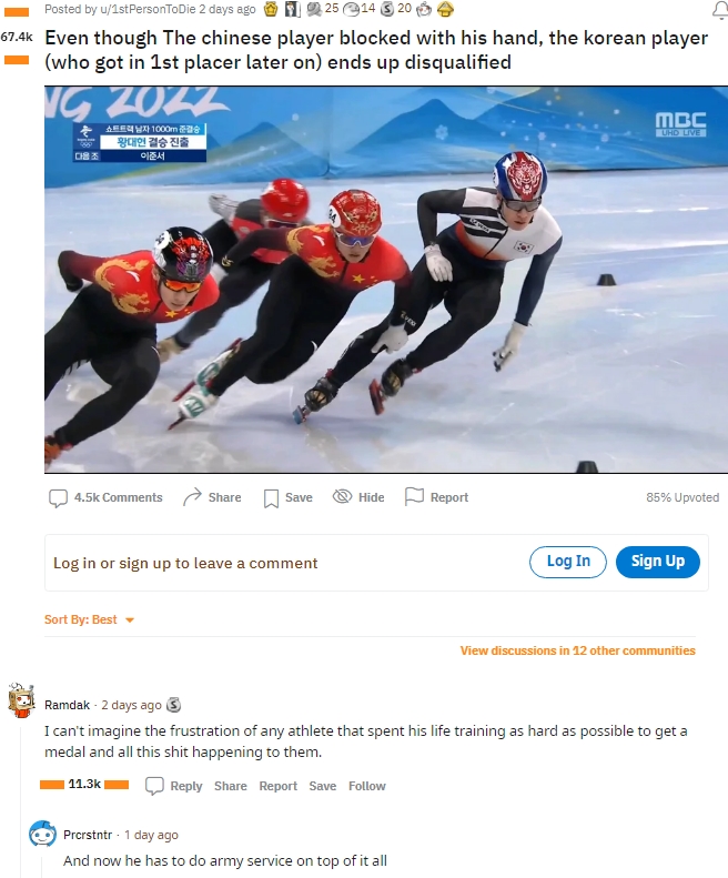 한국선수가 중국선수의 방해에도 1위로 결승선을 통과했는데, 심판들이 말도 안되는 이유를 그를 탈락시켰다는 거야.