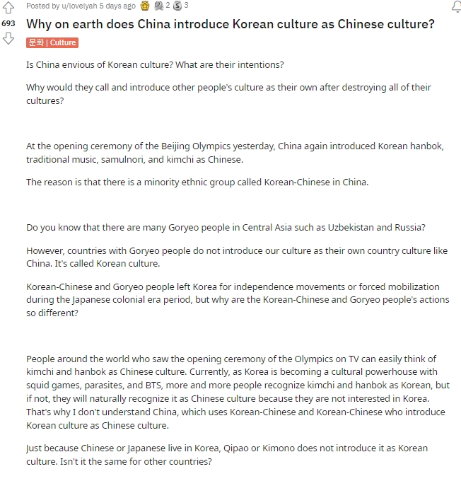 인터넷에서 사람들이 한국문화를 중국꺼라고 오해하는건 크게 걱정하지 않아.