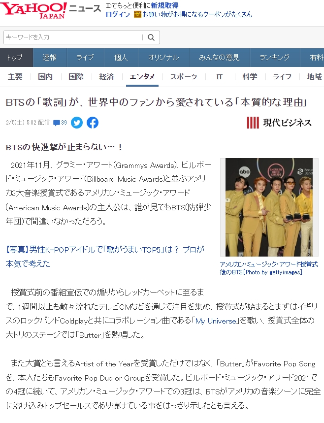 일본 칼럼 기사에서 BTS의 가사가 전세계에서 사랑받는 본질적인 이유에 대해 설명했습니다.