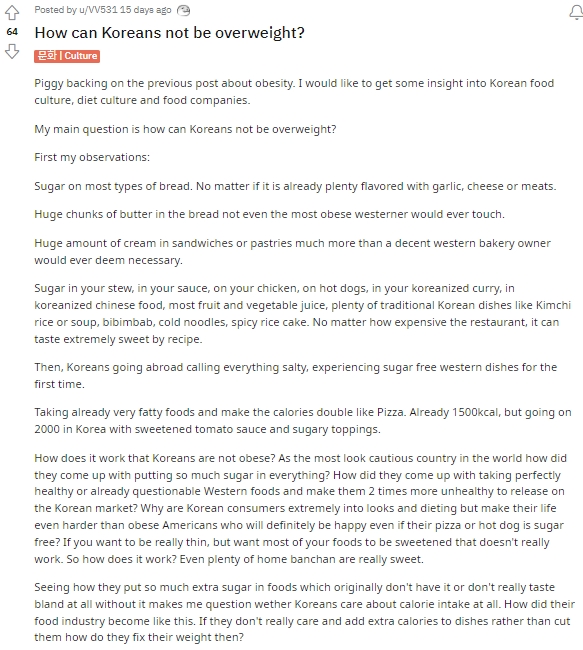 prospect97/이 게시글 작성자는 그냥 유튜브에서 한국 먹방 같은 거 보고 그게 한국의 평균적 식단이라고 생각하는 것 같아.ㅋㅋㅋ