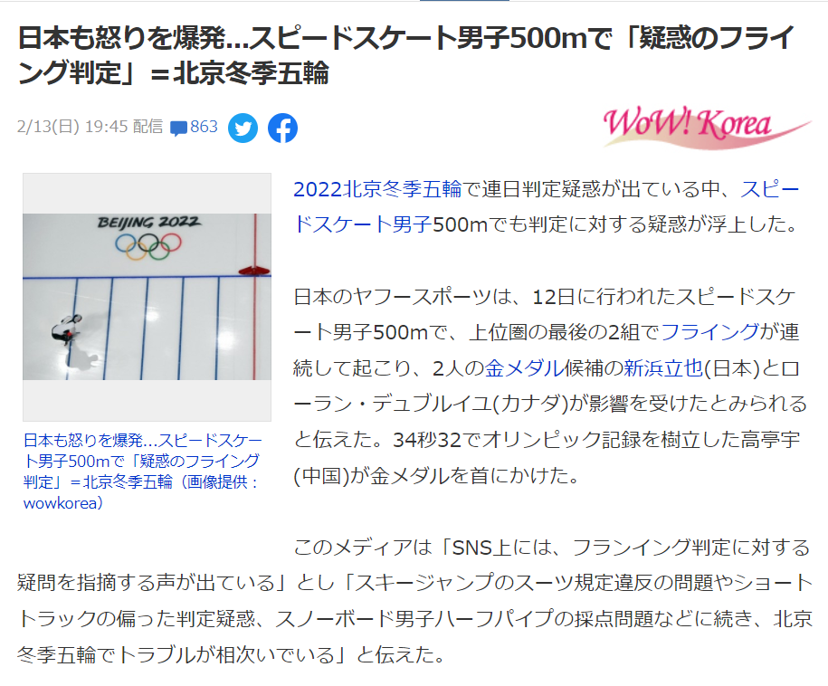 2022 베이징동계올림픽에서 또 판정 논란이 일고 있습니다. 이번엔 스피드스케이팅 남자 500m입니다. 중국 선수 가오팅유가 1위에 올라선 뒤 강력한 우승후보가 있었던 마지막 두 조가 부정 출발 판정을 받았습니다. 그 영향으로 일본 선수 모리시게 와타루가 동메달, 신하마 다쓰야는 20위에 그쳤습니다. 다음은 일본언론의 보도내용과 댓글 반응입니다.