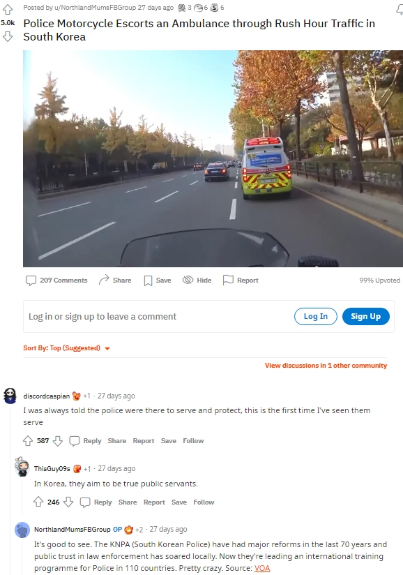 한국의 경찰관이 구급차를 호송하는 영상에 대한 해외반응입니다.