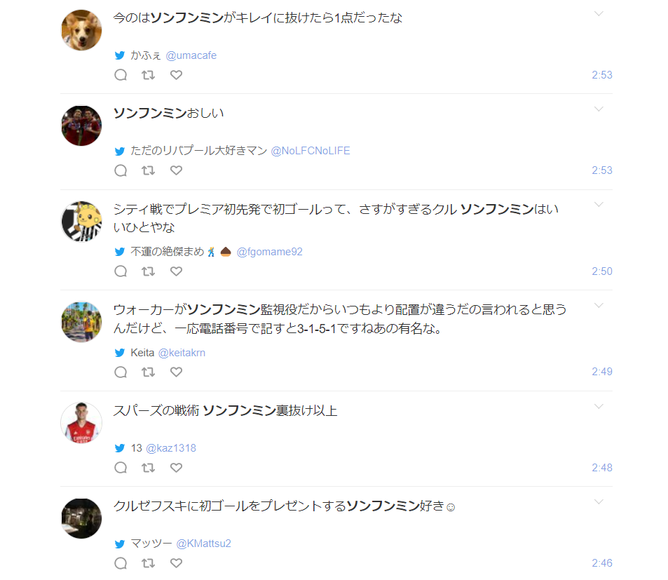 한국시간으로 2022년 2월 20일 오전 2:30 토트넘 홋스퍼와 맨체스터 시티의 경기가 있었습니다 . 80 분을 뛴 손흥민은 2 개의 어시스트를 기록했습니다 . 손흥민의 맹활약 속에 토트넘은 선두 맨시티를 상대로 더블을 기록했습니다 . 아래는 전반전부터 종료 시점까지 일본 네티즌들의 실시간 SNS 반응입니다 .