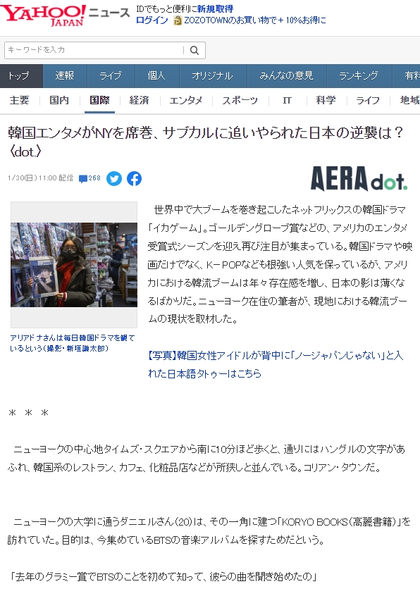 | [JP] 日 칼럼 "한국 엔터테인먼트 뉴욕 석권" 일본 반응 (0) | 2022.02.20 |
