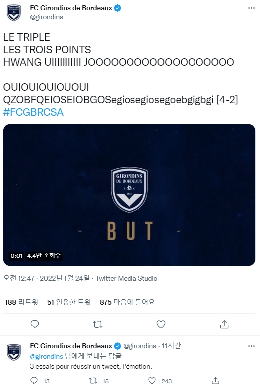 최근 연패로 2부 강등 위기의 분이기여서 그런지 보르도 팬들도 많이 기뻐하는 반응인 것 같습니다.