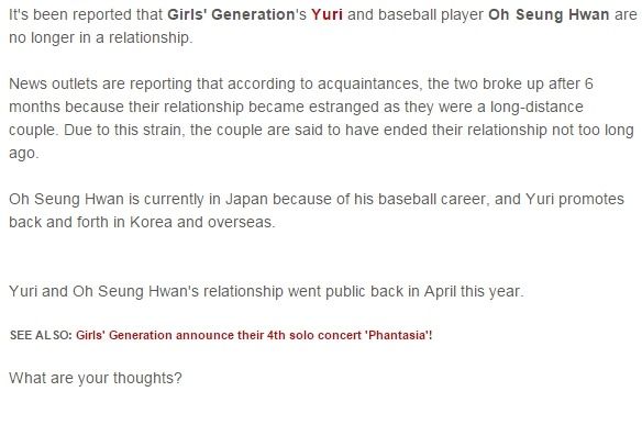 소녀시대 유리와 야구선수 오승환이 더 이상 연인관계가 아니라는 사실이 보고되었다